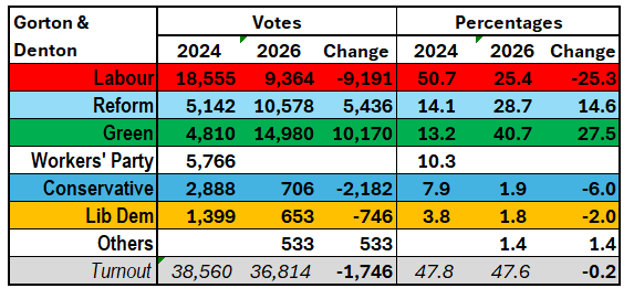 Last May, Reform captured Runcorn and Helsby with 38.7 per cent of the vote, up 20.6 percentage points compared with 2024. Last night’s performance fell short of that: it won 28.7 per cent, up 14.6 points.