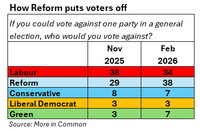 There is another factor, which separates Reform today from the SDP four decades ago. Few voters actively disliked the SDP’s moderation. Reform has not only lost support, it has generated increasing hostility. Last November, and again this February, More in Common asked respondents not just which party they would support, but which they would vote against.