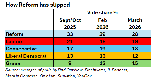 Prime minister Farage? The danger has receded… for the moment. For much of last year, polls and elections consistently showed Reform on course to win the next general election. That has changed. Over the winter, the party has lost support, Nigel Farage’s ratings have slipped, and signs have multiplied of voters’ appetite to vote tactically to defeat Reform candidates.